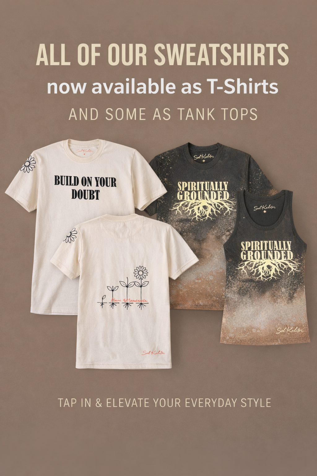 Every Sol Kalitri sweatshirt design can now be ordered as a T-shirt, with select styles also available as tank tops—so you can carry intention, growth, and style into every season.